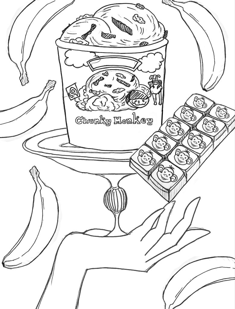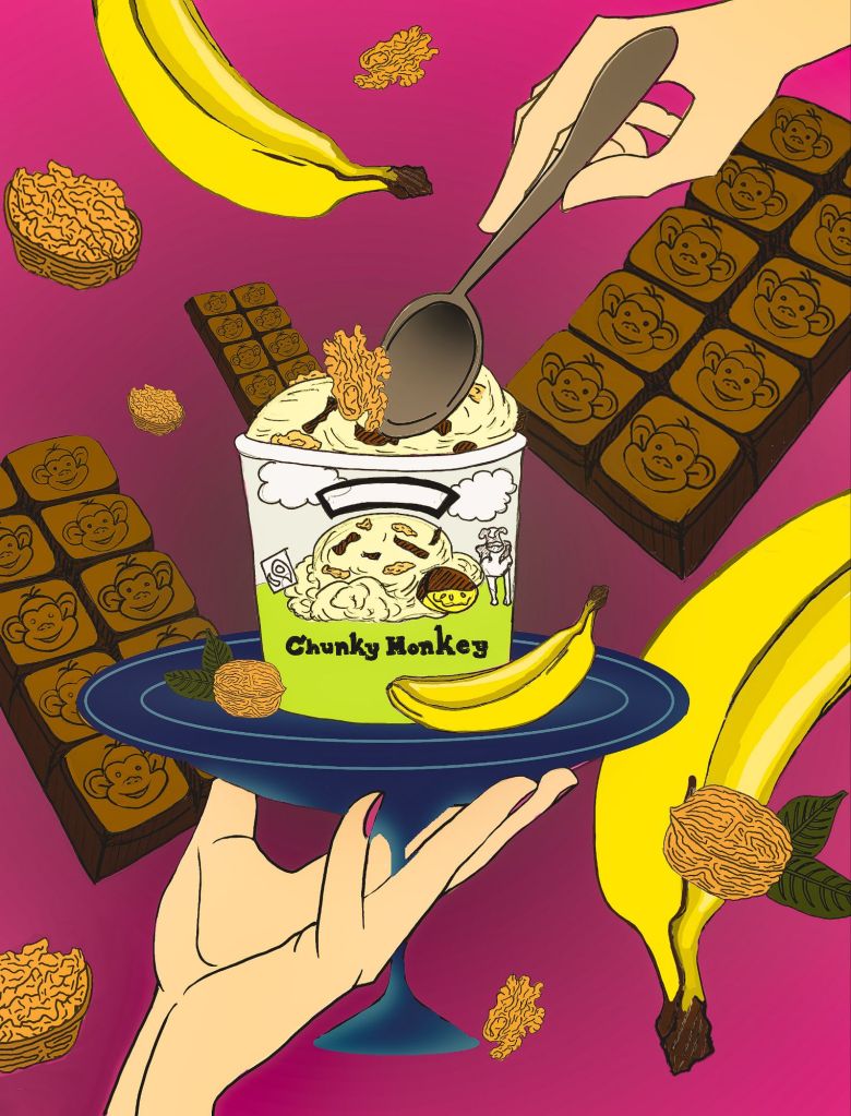 I ended up sticking with Thumbnail 1. The next step was to refine the thumbnail. There were too many bananas, so I added walnuts and more monkey chocolate bars. To balance out the hand at the bottom, I also added the hand at the top with a spoon.