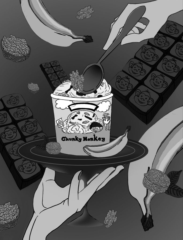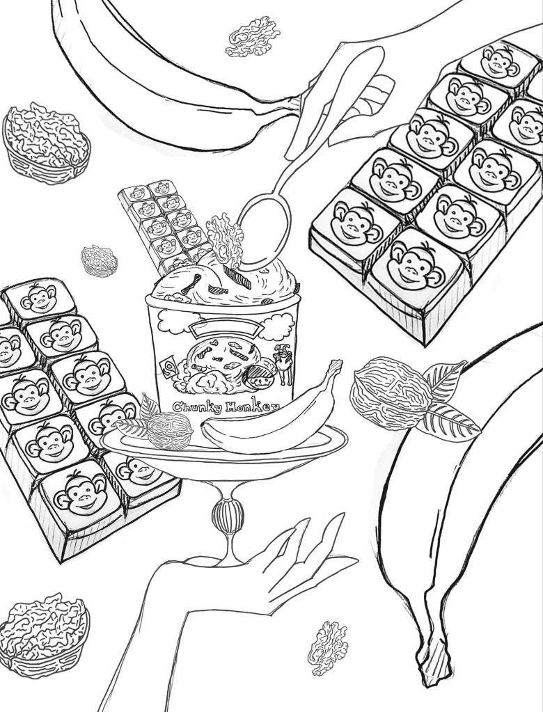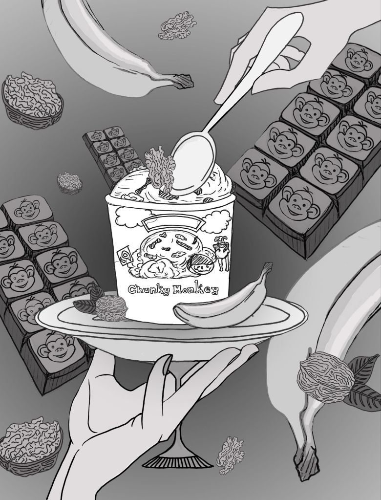 Now that the sketch is more refined, it was easier to see where the design needed to go. There are still some things that need to be adjusted. To make the ice cream the focus of the design, it needed to be bigger. So, I adjusted the hand and platter so I could increase the size of the ice cream carton. I also started mapping out the values for the design.