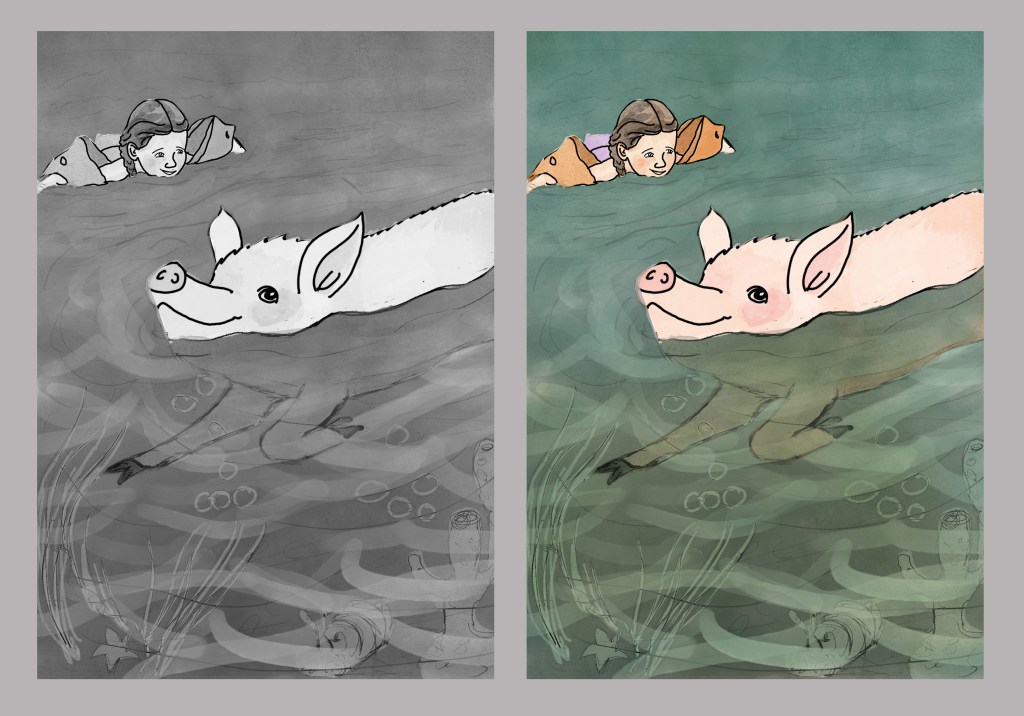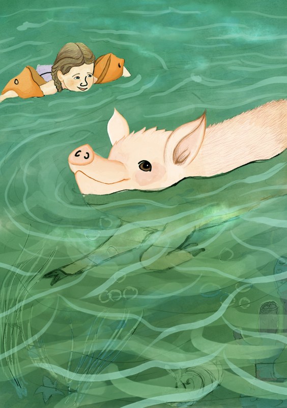 This is the final illustration. I added more vibrancy to the colors in the design as well as adding details in the water to establishment movement and interest. I added texture to pig in the illustration to give it a softer and more furry look. I also added more detail to the little girl in the back.