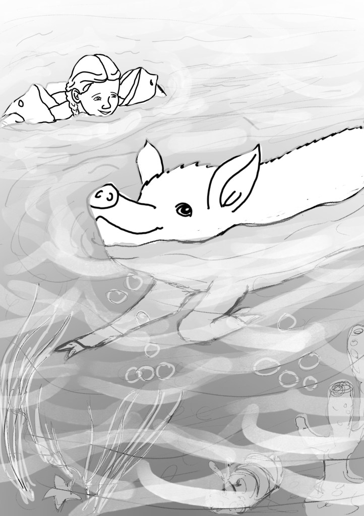 This is the original sketch for the design of the add. It features a young girl with swim floaties in the ocean with a pig swimming in the foreground.