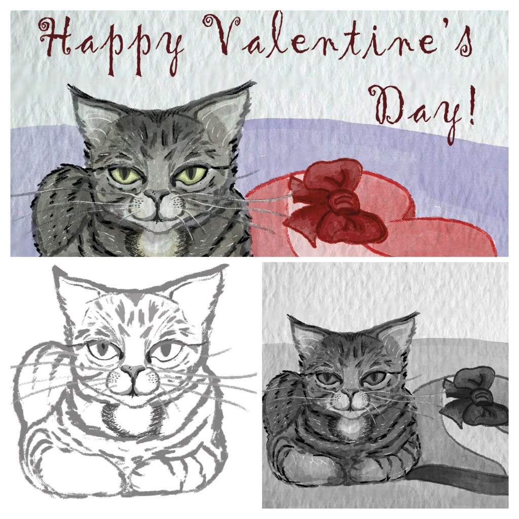 I am gearing up for Valentine’s Day with a new cat illustration. The process of the illustration from sketch, to value study, and final illustration.